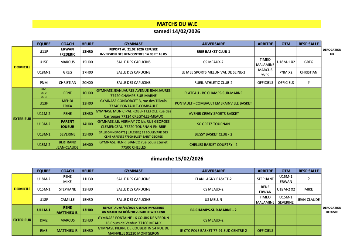 MATCHS DU W.E (VACANCES SCOLAIRES) 21 février