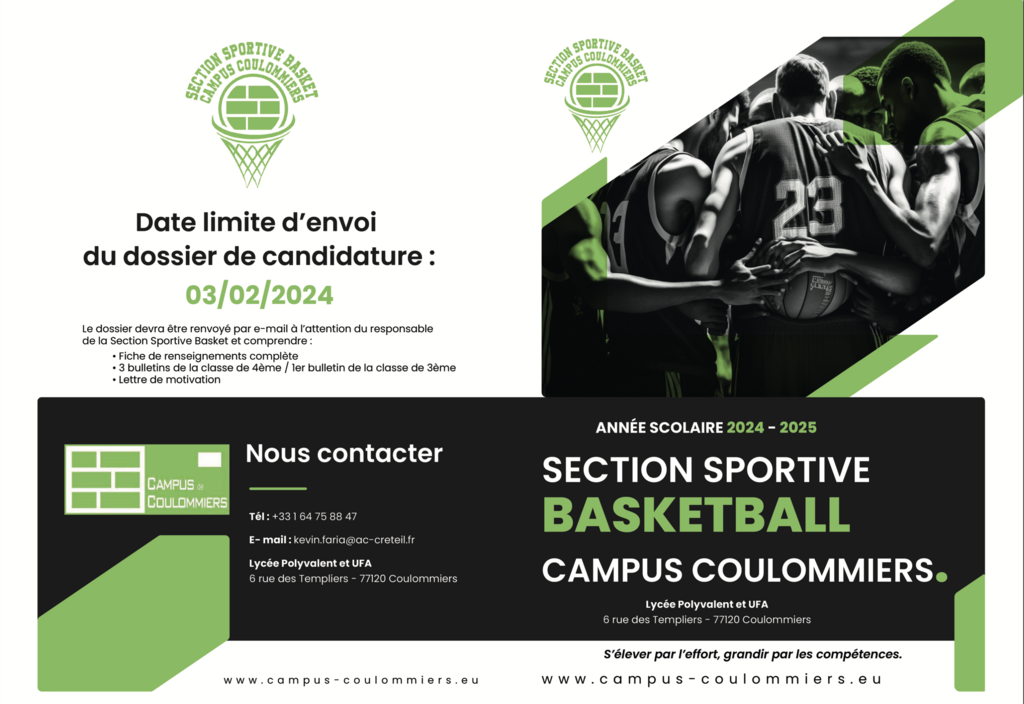Les familles des élèves intéressés doivent renvoyer la fiche de renseignements complétée ainsi que les pièces demandées au responsable de la Section Sportive Basket, Monsieur FARIA (adresse e-mail sur le document Plaquette), avant le 3 février 2024.