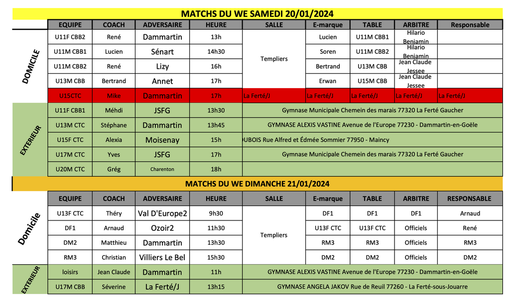 Match du Week-End du 20 et 21 Janvier