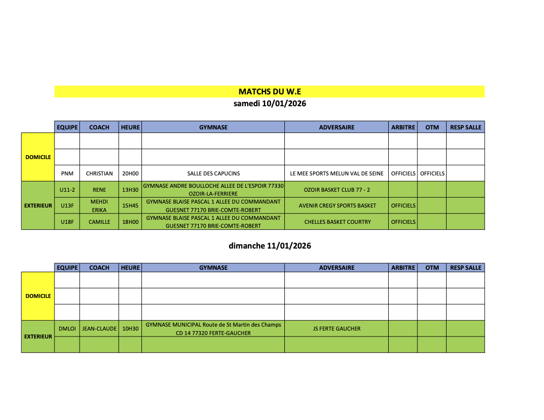 Match du week-end 10 et 11 janvier